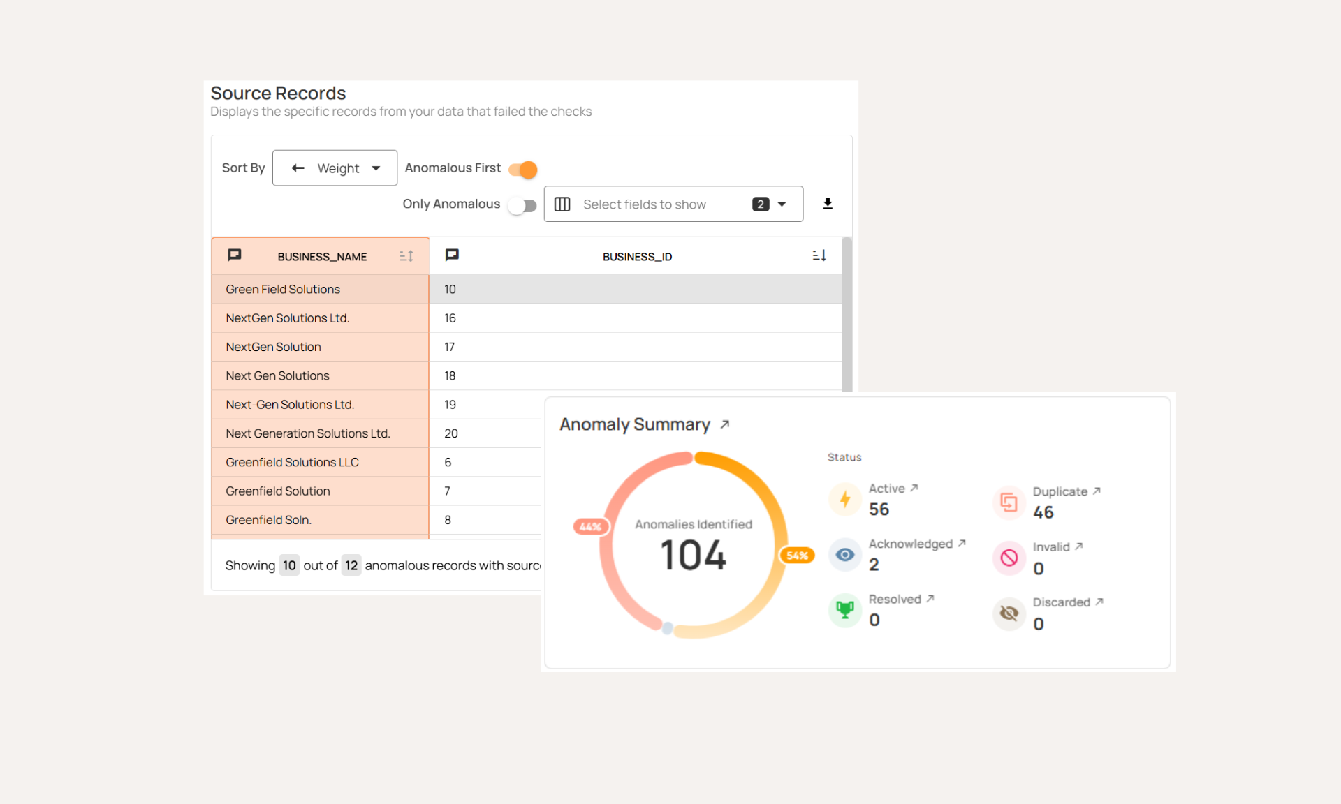The platform continuously evaluates your data against these rules. It surfaces anomalies—from basic schema drift to complex reconciliations and other data concerns —before they reach dashboards, downstream applications, or AI models.