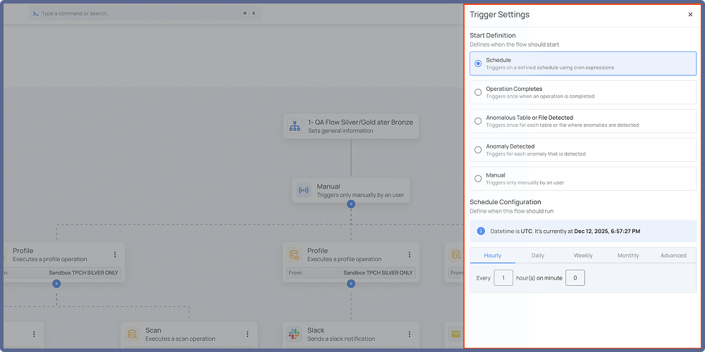 Flows now support a new scheduled trigger type alongside existing event-based options. Configure flows to run automatically at defined intervals using cron expressions—just like scheduling Catalog, Profile, and Scan operations. The flow list displays schedule information and next trigger times right away, so you always know when your scheduled flows will run.