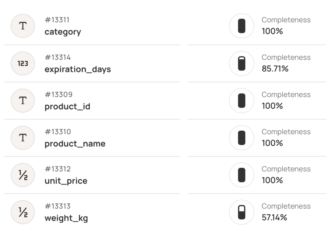 Profiling tools like Qualytics calculate completeness percentages to quantify data gaps across critical fields, as shown in the diagram below.