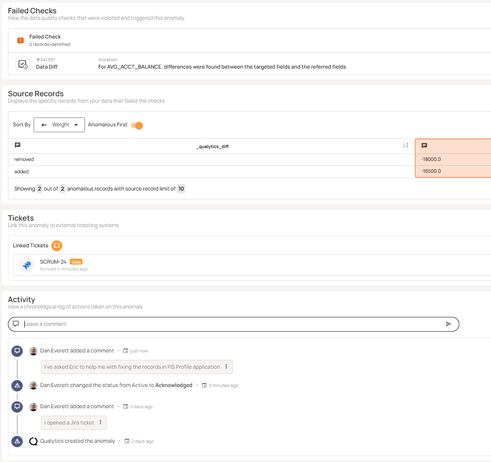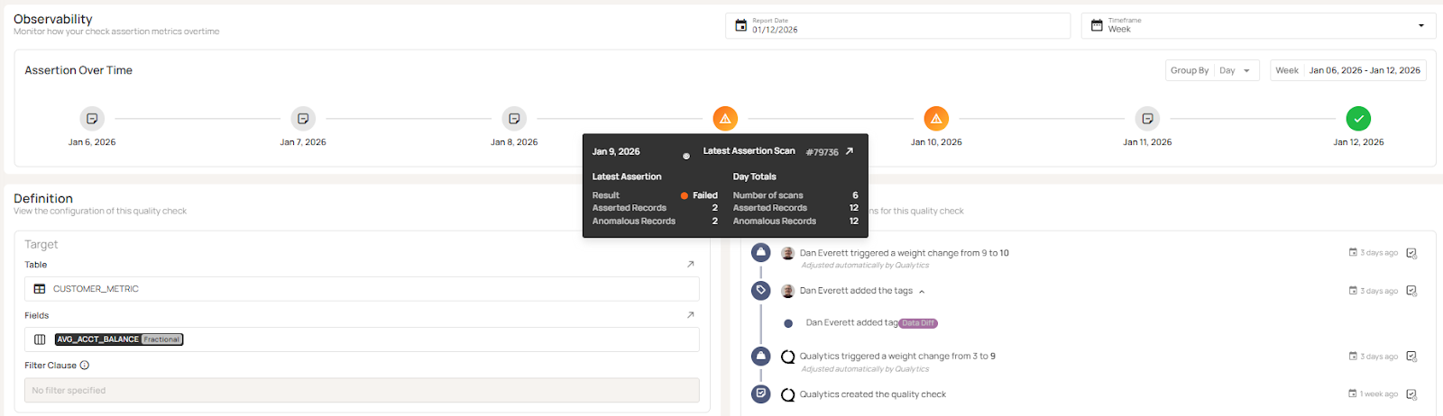 Check and Anomaly History provide detailed observability, version history and activity information about data quality checks and data anomalies managed in Qualytics.