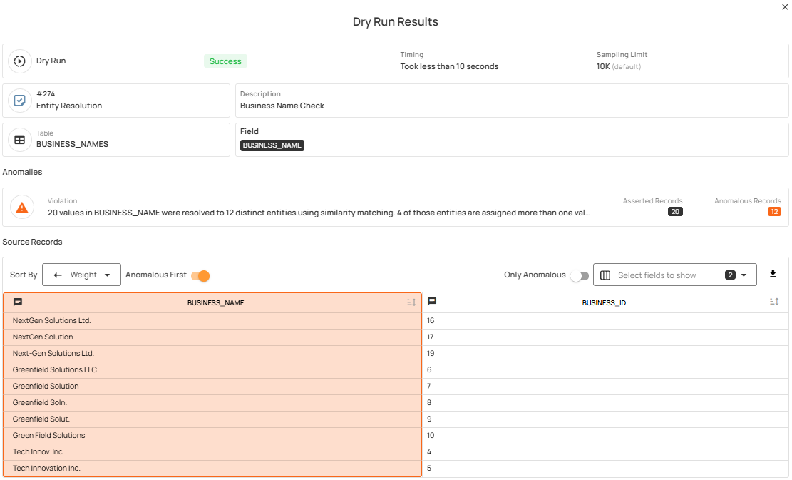 Dry Run allows teams to test checks and preview results before activating them. Checks can be validated, tuned, and reviewed without generating anomalies or impacting production workflows.