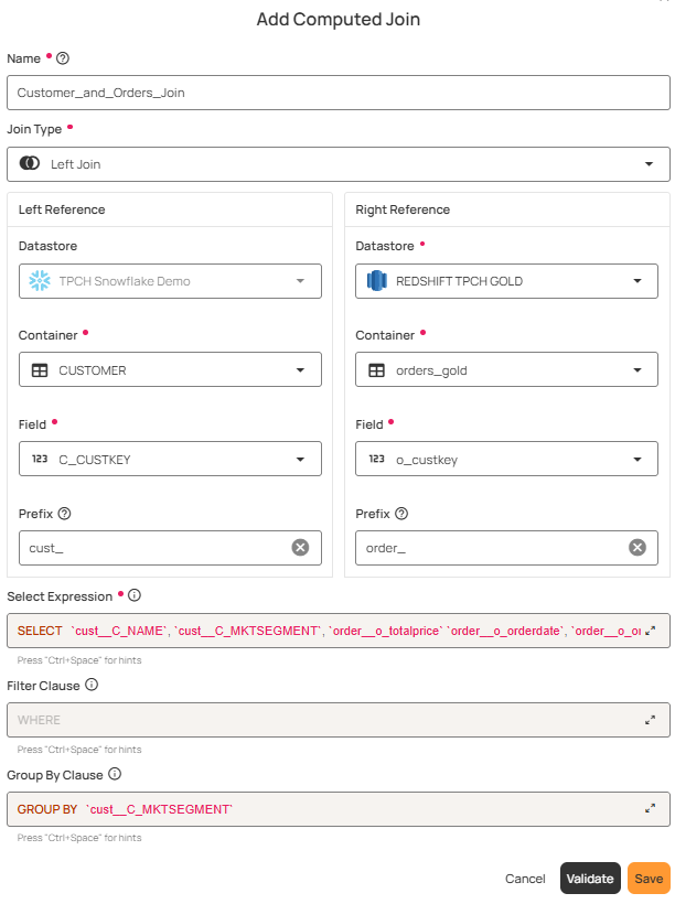 A Computed Join container allows you to combine data from two different source datastores (e.g., a database table vs. a file system container). You can choose the join type (Inner, Left, Right, or Full Outer) and apply transformations, filters, and custom queries to the joined result.