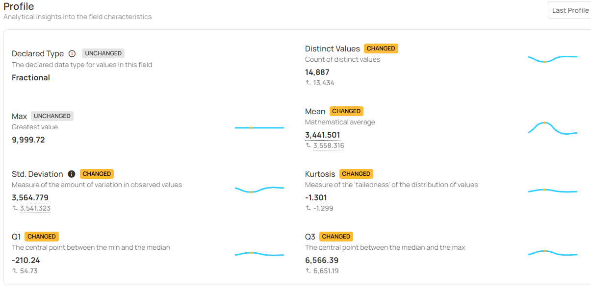 - Compare current and historical field profiles to identify changes in statistical metrics and distributions.
