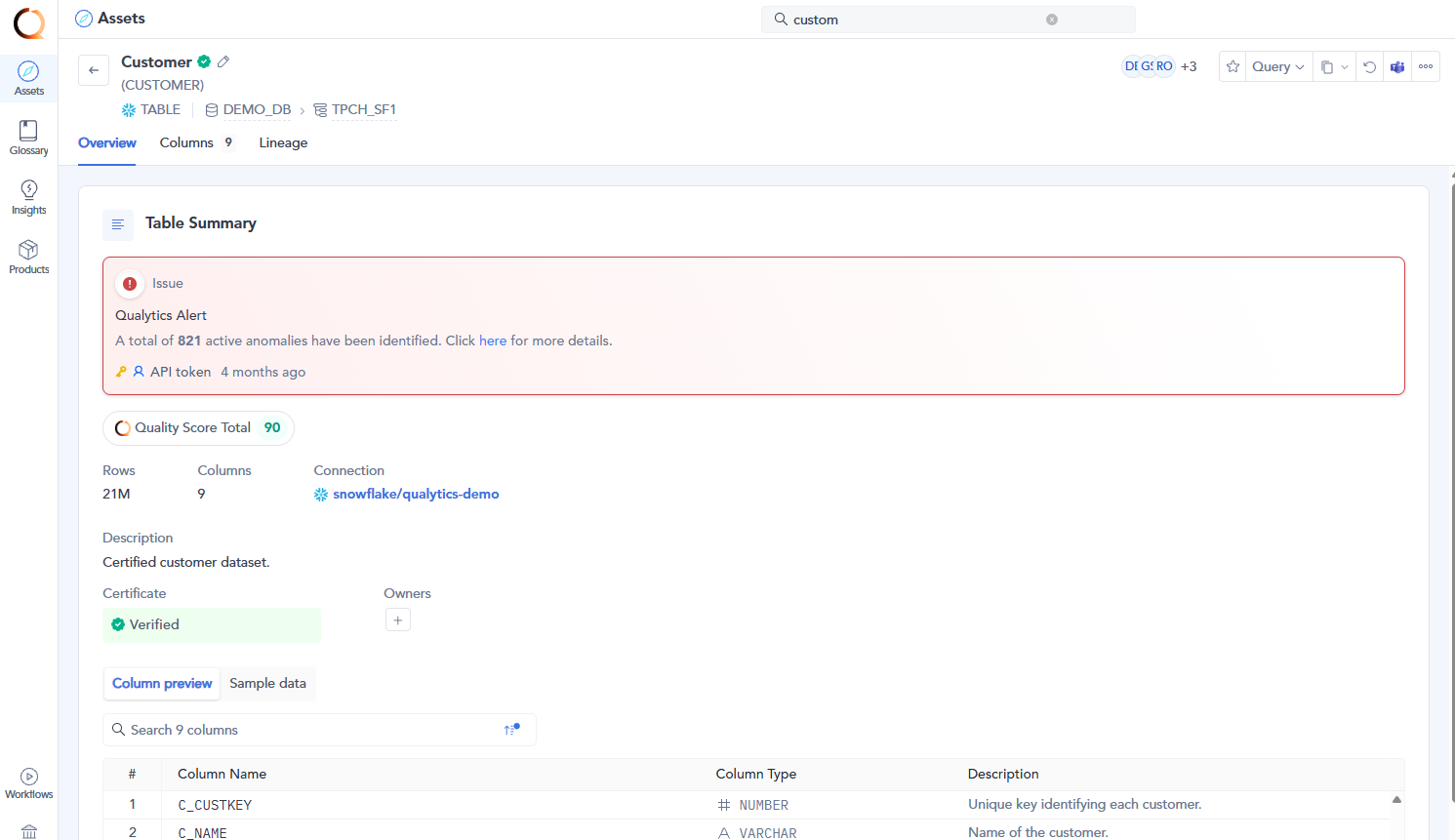 - Keep ownership, tags, and governance context aligned between Qualytics and cataloged assets.