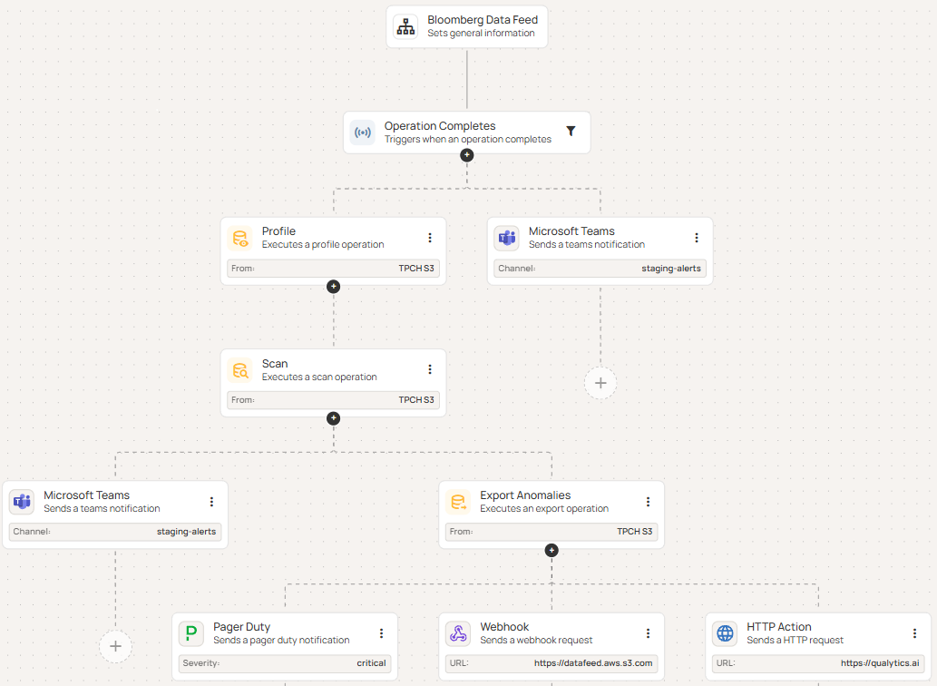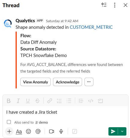 The Qualytics platform integrates with popular enterprise messaging and ticketing platforms, such as Slack, Microsoft Teams, Jira, and ServiceNow to enable two-way, real-time communication and collaboration about data quality events.