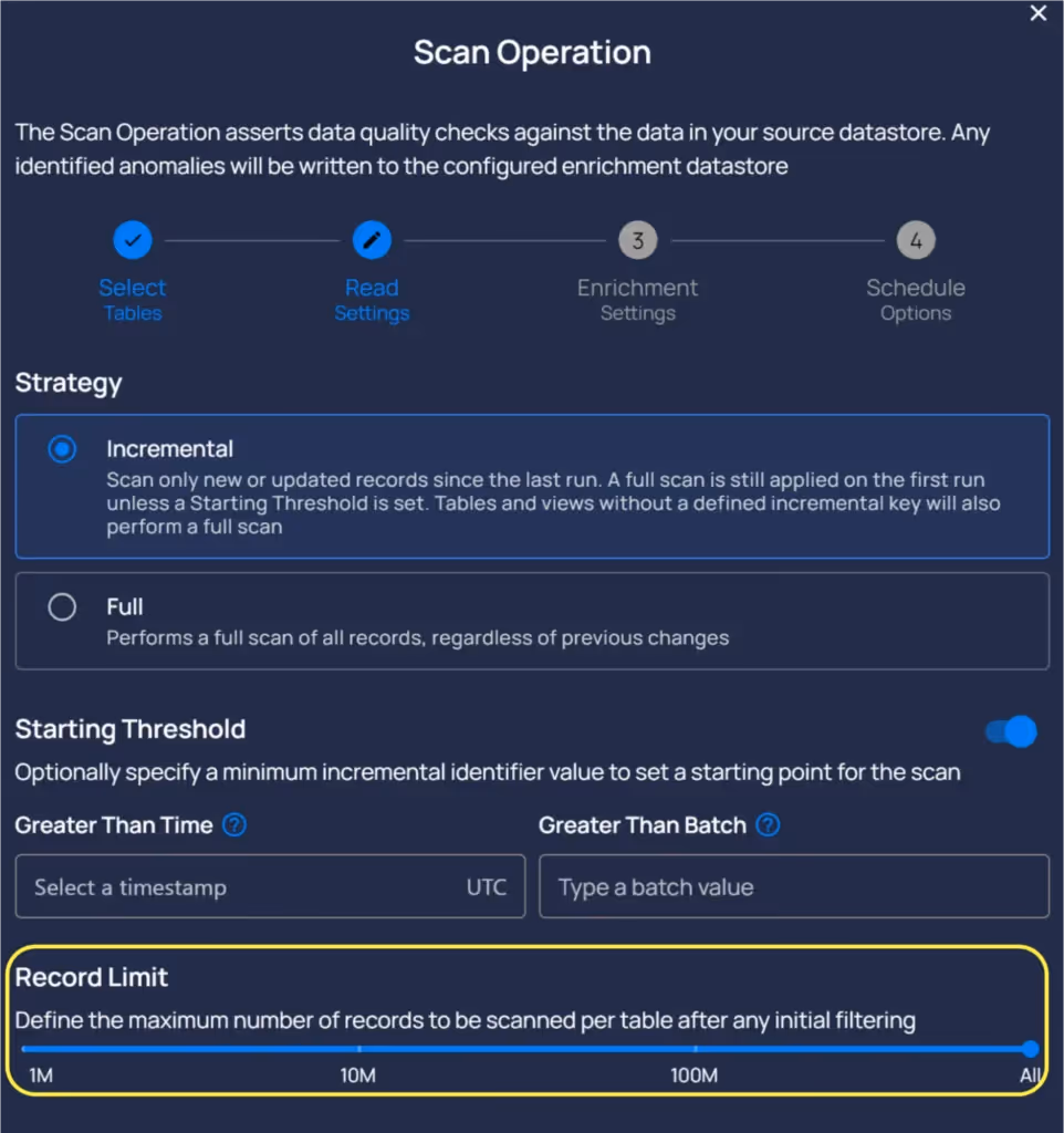 - Mirroring an already-existing feature of Profile Operations, we have introduced a “Starting Threshold” option for Incremental Scans. This feature allows users to manually set a starting value for the incremental field, giving users more control over which records are evaluated.