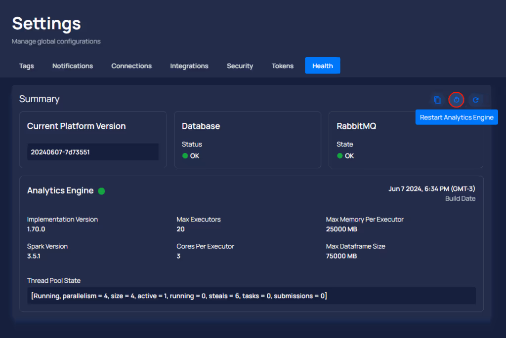 - Introduced a new "Restart" button under the Settings - Health section, allowing admins to manually restart the Analytics Engine if it is offline or unresponsive.